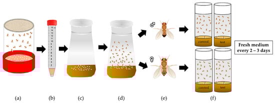 Implementation of a lifespan experiment. (a) Adult flies are transferred into an egg-laying cage covered by a grape agar plate with active yeast paste. After 24 h, the grape agar plate is replaced and inoculated with only a small spot of active yeast paste. (b) The next day, flies are removed from the cage, and the laid eggs are removed from the surface of the plate with a cotton swab and a physiological buffer or saline solution. The egg suspension is rinsed three times with buffer or saline solution before (c) aliquots of the egg suspension are transferred to cultivation medium, where egg-to-adult fly development occurs within approximately 10 days. (d) After hatching, the mixed fly populations are transferred to fresh standard medium for mating. (e) Forty-eight hours later, the adult flies are usually separated into male and female cohorts. (f) Approximately 20 to 30 flies per sex are placed in a vial with a control or experimental medium. Four to five replicates are used to obtain a total number of at least 100 flies per sex and treatment. The flies are transferred to fresh medium every 2 to 3 days, and the number of dead flies is documented at each transfer. This documentation is continued until all flies are dead (modified from [,]).