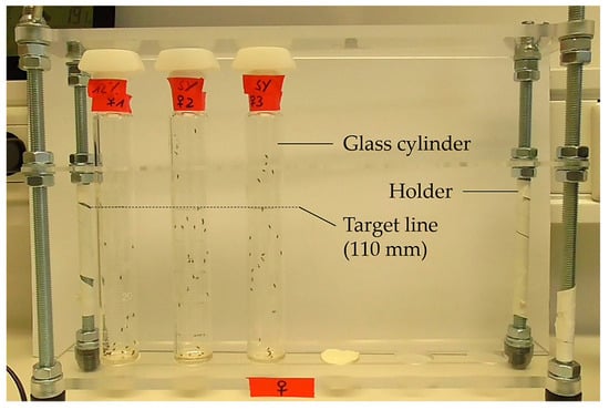 The rapid iterative negative geotaxis (RING) assay, also called the climbing assay, is used for the determination of induced activity (Figure 8). Flies are inserted into vials that are fixed in a holder with a marked target line (RING apparatus). Tapping the RING apparatus makes the flies drop to the bottom of the vials. Negative geotaxis causes flies to have a natural drive to move upward as fast as possible, and the response is more rapid in younger and healthier flies than in older and/or more conspicuously disabled flies [,]. Combining negative geotaxis with the video recording of flies enables the identification of smaller differences in locomotor ability [].