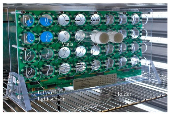 Drosophila Activity Monitoring (DAM) system (TriKinetics). Flies are placed in glass vials that contain experimental food and are covered with plugs. The vials are inserted horizontally into the slots of the holder of the activity monitor. In the center of each slot, an infrared light sensor is installed, which generates a signal whenever the sensor is interrupted by a crossing fly. The activity monitor is linked to a computer, and via the DAM system software, locomotion data from up to 32 vials can be recorded simultaneously (modified from []).
