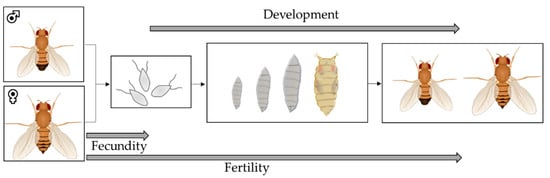 In D. melanogaster, the period of time from maturation to fertility is sex-dependent. In males, the sexual maturation period length is approximately two days [], and in females, it is about three days post hatch []. When females are in regular contact with males, the maximum peak of oviposition is attained after one week, after which the egg numbers continuously decline until infertility of the females occurs after approximately 50 days []. The important parameters for the characterization of reproduction are fecundity, fertility and development (Figure 10).