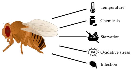 Environmental modifications such as extreme temperature, low food supply, infections or altered oxygen and salt concentrations act as stressors for D. melanogaster and may result in homeostatic imbalance []. The impacts of different stressors on the health and fitness parameters of D. melanogaster are investigated in laboratory settings (Figure 11), where stress exposure is combined with an additional method for phenotyping, such as determination of the survival rate, climbing activity, fecundity or metabolic analyses. Again, it is important to work with groups of flies of the same sex and age. To study the impact of food on stress tolerance, flies are either prefed with or maintained on experimental diets.