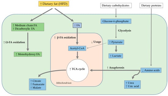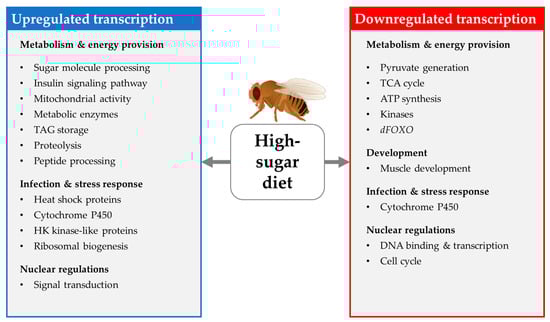 HSD or HFD feeding induces an obese phenotype with increased fat storage in D. melanogaster [,]. In addition, it was demonstrated that the hormones of energy metabolism (e.g., insulin-like peptides (Dilps) (a functional homolog of vertebrate insulin), unpaired2 (a functional homolog of vertebrate leptin), adipokinetic hormone (a functional homolog of vertebrate glucagon)) respond to these dietary interventions in a manner such that obesity comorbidities, e.g., insulin resistance, can be provoked []. Accordingly, the fruit fly has become an attractive model for studying the key metabolic processes and phenotypes of obesity and potential comorbidities. Both HSDs and HFDs are characterized by a high energy density and exhibit a low saturation effect and a good sensory quality [].