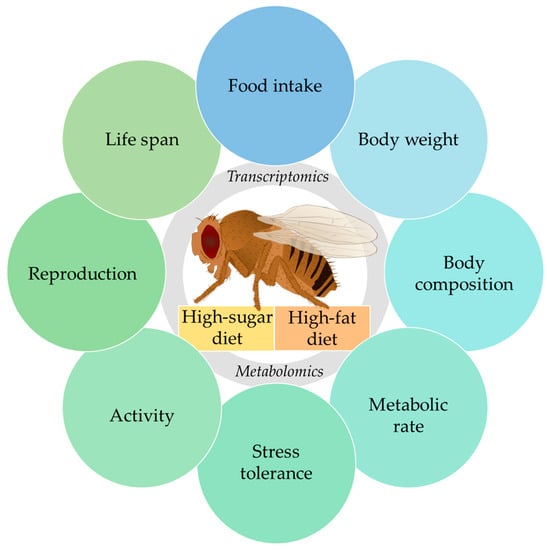 In the first part of this review, methods for phenotyping D. melanogaster in a nutritional context are outlined, and the advantages and disadvantages of the different methods are illustrated. In the second part, the application of comprehensive phenotyping is demonstrated with examples of dietary interventions, namely high-sugar diet (HSD) and high-fat diet (HFD) feeding. Finally, studies regarding the impacts of HSD and HFD feeding on the transcriptome and metabolome of D. melanogaster are presented, which place the nutritional phenotypes in the context of underlying cellular and molecular mechanisms.