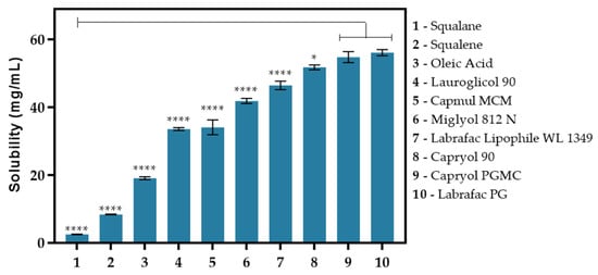 Disulfiram solubility in liquid lipids. * p-value < 0.05, **** p-value < 0.0001.