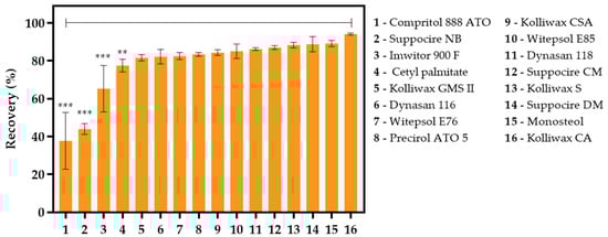 Disulfiram partitioning in binary mixtures of solid lipids and water, determined as recovery (%). ** p-value < 0.01, *** p-value < 0.001.