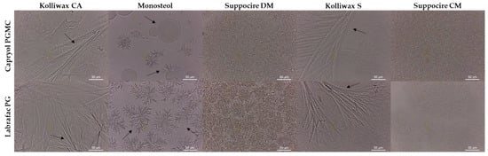 Microscopic evaluation of the physical compatibility of liquid and solid lipid mixtures. Black arrows denote sites of physical instability. Scale bar: 50 µm.