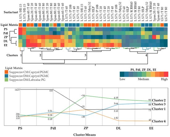 The hierarchical clustering of the formulations, evaluated 15 days after production, separates them in four major clusters: Cluster 1, with increased particle size and dispersion, Cluster 2, with the lowest |zeta potential| and the highest DSF loading, and Clusters 3 and 4, differing mainly on DSF loading and entrapment efficiency (Figure 5). Cluster 1 encompasses drug delivery systems with pronounced instability, with loss of colloidal size and increased particle aggregation (day 1, PS = 42 ± 2 nm, PdI = 0.21, ZP = −34 ± 1 mV vs. day 15, PS = 1609 ± 97 nm, PdI = 0.914, ZP = −33 ± 1 mV). Both formulations were emulsified with Kolliphor HS 15. ZP values higher than |30| mV are reported to predict good stability, as it allows a sufficient electrostatic repulsion between dispersed nanoparticles []. The production of carriers complying to this thumb rule but lacking in stability is common, indicating that ZP alone may not be a good predictor of stability. In fact, surfactants and other surface modifications (e.g., polyethylene glycol, chitosan) may also provide additional steric stabilization, in which their polymeric structure reduces particle interactions, despite the lower magnitude of ZP values []. Cluster 2 groups the majority of formulations constituted by the Span X/Tween X combinations, which are characterized by a nanometric size and monomodal distribution as well as favorable entrapment efficiencies and drug loading. Cluster 3 includes several NLCs with reduced size but somehow polydisperse and stabilized by several surfactants, including Lipoid S75/Tween 20, Lipoid S75/Tween 40, and Lipoid S75/Tween 60. Cluster 4 includes unfavorable NLCs in terms of drug encapsulation, despite their reduced size. Interestingly, NLCs produced with Lipoid S75/Tween 80 belong to this cluster.