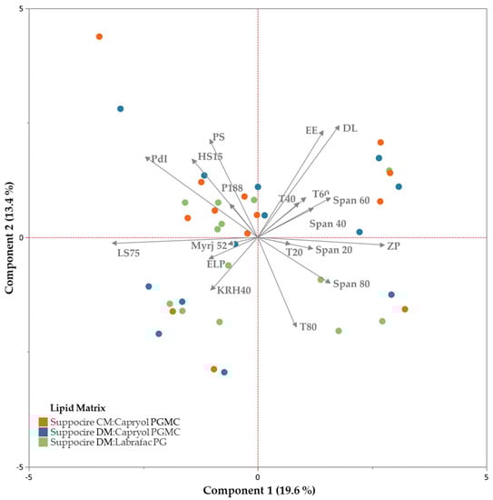 The composition trends of NLCs can be evaluated through the representation of the first two principal components in a Cartesian plane, in which the association between NLC excipients and colloidal properties are discriminated (Figure 6). Tweens/Spans and other surfactants play a different role in colloidal properties, as they are distributed in different quadrants (right and left, respectively). In fact, the first principal component distributes formulations based on their surfactants. Accordingly, polysorbates in combination with the respective alkyl sorbitan esters are efficient emulsifiers for a matrix composed by Suppocire CM:Capryol PGMC, which also maximize DSF loading and entrapment while maintaining a monomodal size distribution. Nonetheless, their emulsification efficiency is similar and do not show significant differences between themselves. Kolliphor RH40, Kolliphor ELP, Kolliphor P188, and Myrj 52 also show a similar behavior in stabilizing the formulations.