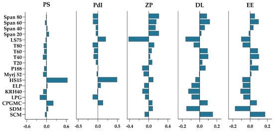 Partial least squares regression coefficients for surfactants, liquid, and solid lipids, considering five responses: particle size (PS), polydispersity index (PdI), zeta potential (ZP), drug loading (DL), and entrapment efficiency (EE) of disulfiram encapsulating NLCs.