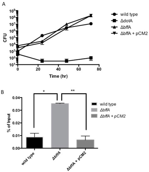 L. pneumophila is an intracellular pathogen, with a large portion of its lifecycle spent replicating within a Legionella-containing vacuole inside of protozoans in the environment, or macrophages during human infection [2,40,41,42,43,44,45,46,47,48]. Since we observed altered growth kinetics on solid media, we determined the intracellular growth rate of ΔbffA in A. castellanii, which is considered a natural host for L. pneumophila in the environment. We found that in A. castellanii, ΔbffA has a slight enhancement in intracellular growth rate compared to wild-type (Figure 2A). We were unable to see the reversal of the ΔbffA phenotype to a wild-type phenotype in this assay due to the inability to maintain adequate levels of antibiotics in the media over the three-day time course. The complementation strain rapidly loses the vector carrying bffA within 48 h of inadequate antibiotic levels, making complementation impossible. We have observed that, when grown on CYE without antibiotics, the complemented strain forms single colonies in two days, and these colonies no longer possess the ability to grow on antibiotic-containing plates, indicating they have lost the complementation vector (not shown). Additionally, through these experiments, we observed a large increase in the uptake of the ΔbffA strain into the amoebae at time zero, which is reverted to wild-type levels with the expression of bffA in trans. We further tested uptake levels using a gentamicin protection assay, in which bacteria that are not taken up by A. castellanii are killed by the addition of the antibiotic gentamicin to the amoebae medium. For this assay, amoebae are infected with a high multiplicity of infection (MOI), and the output, i.e., what is collected from the lysed amoebae after antibiotic treatment, is normalized to the input to generate a percentage of the input that is protected from antibiotic treatment. Figure 2B shows that ΔbffA has significantly enhanced uptake into A. castellanii and the addition of bffA in trans reverted the uptake rate back to wild-type levels, indicating a phenotype specific to the deletion of bffA. The increased uptake phenotype of ΔbffA could be a manifestation of the altered growth rate during the short infection. Alternatively, bffA may function in the downregulation of uptake into amoebae through a yet-unknown mechanism.