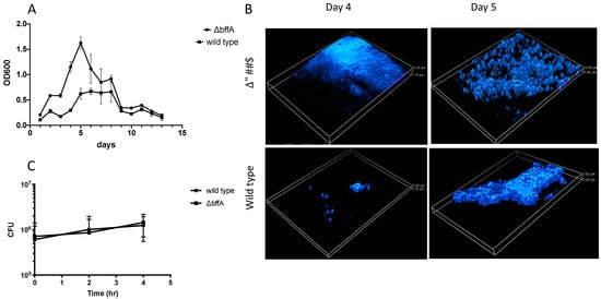 In many bacterial species, including P. aeruginosa and V. cholerae, planktonic growth and biofilm growth are regulated in an opposing manner [49,50,51]. Based upon this and on our previous experiments with the ΔbffA strain, we hypothesized that the deletion of bffA would lead to a shift in the growth of the ΔbffA strain to a biofilm lifestyle, as opposed to a motile, planktonic lifestyle. Since we have already observed alterations in growth on solid media and virulence, we sought to establish several biofilm assays to test the ability of ΔbffA to form biofilms. In a 96-well biofilm formation assay, plate grown bacteria were resuspended to an OD600 = 0.3 and plated at 200 μL per well of a 96-well plate. For each time point during the 12 days of the experiment, washed wells were stained with 0.5% crystal violet to measure the degree of biofilm formation. The crystal violet was then resolubilized from the stained biofilms in 30% acetic acid, and the OD600 was measured. We observed that all biofilms formed at the air-liquid interface, and the ΔbffA strain formed biofilms more rapidly and densely than the wild-type strain (Figure 3A). This indicates that bffA may be involved in the regulation of biofilm formation. Attempts to complement this phenotype were unsuccessful due to the instability of the complementation vector in the ΔbffA strain.