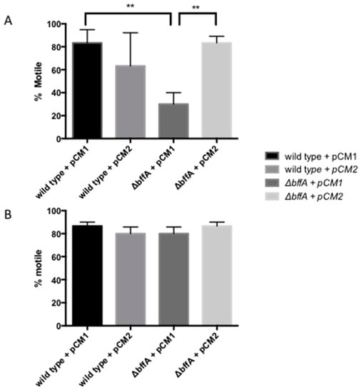 Motility and biofilm formation are inversely regulated in bacteria [26,27,49,52], so we sought to determine if we could observe reduced motility in the ΔbffA strain since we previously observed enhanced biofilm formation compared to wild-type. With the lack of a plate-derived motility assay, we used light microscopy to measure the percentage of the population displaying flagellar motility in several overnight cultures. Using this approach, we determined the level of motility in the wild-type and ΔbffA strains, as well as in wild-type and ΔbffA harboring pCM2. We set up 12 cultures and 6:7 serial dilutions of each strain, starting with an OD600 = 0.5. By setting up a series of cultures, we expected that we would be able to capture the bacteria at peak motility. The cultures were grown overnight at 37 °C, and the OD600 was measured again in the morning, followed by subsequent microscopic analysis for motility. We observed that wild-type, wild-type-pCM2, and ΔbffA–pCM2 were able to reach peak motility levels of 90% (Figure 4A), independent of culture density. On the other hand, the ΔbffA strain had very limited motility, regardless of culture density, and the highest level of motility we were able to record for this strain was 20% of the culture displaying flagellar motility (Figure 4A).