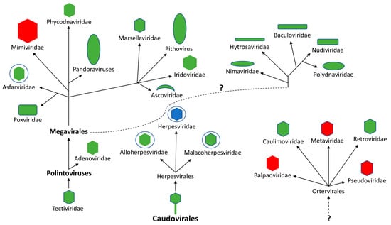 - Davison, A.J.; Eberle, R.; Ehlers, B.; Hayward, G.S.; McGeoch, D.J.; Minson, A.C.; Pellett, P.E.; Roizman, B.; Studdert, M.J.; Thiry, E. The order Herpesvirales. Arch. Virol. 2009, 154, 171–177. [Google Scholar] [CrossRef]