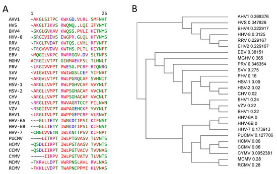 - Montague, M.G.; Hutchison III, C.A. Gene content phylogeny of herpesviruses. Proc. Natl. Acad. Sci. USA 2000, 97, 5334–5339. [Google Scholar] [CrossRef] [PubMed]
