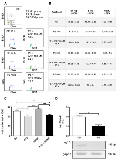 Cytofluorimetric analysis confirmed that PE treatment increased the percentage of the SCs in S phase already after 16 h of treatment (Figure 1A,B). In fact, SCs maintained in FBS and forskolin, showed the typical cell proliferating profile, with a percentage of S phase of 16.41% ± 3.36%, whereas, after PE exposure, the percentages were 21.15 ± 2.4% after 16 h, 24.95 ± 0.85% after 24 h and 17.13 ± 0.46% after 48 h, supporting the idea that PE has a positive effect on SC proliferation. This increase was counteracted by APE treatment already after 16 h of treatment. After 24 h and 48 h, the M2-mediated decrease of the cells in S phase was more evident (Region R3, Figure 1A). In fact, after 16 h of co-treatment, the percentage of cells in S phase was 15.1 ± 2.45% but, after 48 h, it was strongly reduced to 1.38 ± 0.41%. In order to understand if the effect of PE may be explained by the presence of GGF/NRG1, MTT assays were performed upon NRG1 and APE treatments (Figure 1C). As already demonstrated, NRG1 treatment increased cell growth, whereas APE treatment reduced significantly the cell growth; interestingly, APE plus NRG1 co-treatment showed the same cell number observed after APE treatment, confirming the inhibitory effect of APE on cell proliferation-NRG1 induced. It was also interesting that SCs treated with PE showed a significant downregulation of the transcript levels of nrg1 type I (Figure 1D), suggesting that NRG1 present in PE negatively counteracted its autocrine production by SCs.