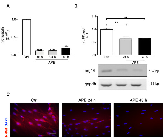 M2 activation, APE-mediated, significantly downregulated nrg1 transcript levels already after 16 h of APE exposure (Figure 2A). Using different primers able to recognize the nrg1 type I isoform, RT-PCR analysis showed a significant downregulation of the nrg1/I transcripts after 24 h and 48 h of treatment (Figure 2B). The immunocytochemistry analysis demonstrated a progressive reduction in immunopositivity for NRG1 protein in SCs after 24 h and 48 h from APE treatment (Figure 2C).