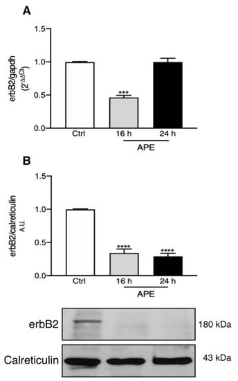 ErbB2 expression is modulated by M2 agonist APE. (A) qRT-PCR analysis shows the decreased expression of erbB2 receptor transcripts after 16 h of APE treatment (APE 16 h: *** p < 0.001; n = 3); (B) Representative Western blotting showing the decreased expression of erbB2 receptor after 16 and 24 h of APE treatment; the graph represents the average of the OD ± SEM of the bands normalized against the reference protein (**** p < 0.0001; n = 3). Calreticulin was used as reference protein considering the prevalent accumulation of erbB2 receptors in endoplasmic reticulum (ER) after APE treatment.