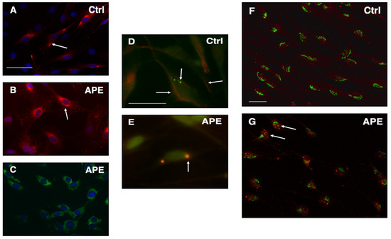 Immunocytochemistry analysis of ErbB2 expression upon M2 agonist treatment. Immunostaining for erbB2 receptors (red staining) in untreated (A) and APE treated SCs (B). The arrows indicate the different localization of erbB2 receptors. In (C) is shown the immunostaining for BIP (green staining), a typical ER marker (scale bar = 150 µm). The localization of erbB2 receptors changes after M2 agonist stimulation, resulting mainly in perinuclear regions of the cells. (D,E) Co-immunostaining for erbB2 (red staining) and Lamp-1 (green staining), marker of lysosome, or (F,G) GM-130 (green staining), marker of Golgi apparatus. The immunostaining clearly demonstrates that erbB2 receptors co-localize with Lamp-1, (E; scale bar = 50 µm), but not with the Golgi marker, after M2 agonist treatment (G), (scale bar = 100 µm). The arrows in G indicate the red spots expressing erbB2 receptors in APE treated cells that may be lysosomes/endosomes.
