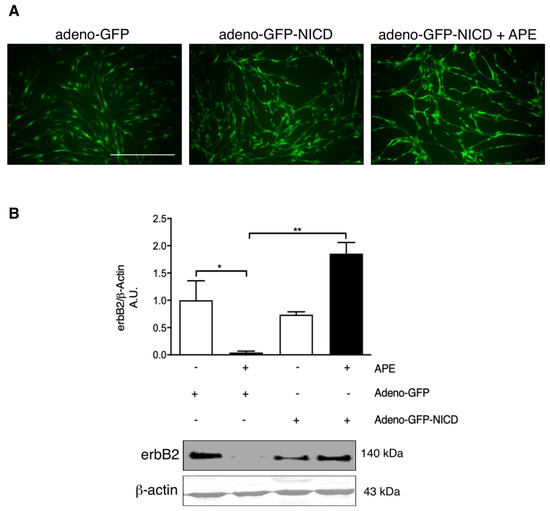 In the cells infected with the control vector adeno-GFP, APE treatment induced a reduction in erbB2 protein expression, similar to that observed in not infected cells (Figure 3B and Figure 5B). On the contrary, when SCs were infected with the adeno-NICD-GFP, any variation in erbB2 protein expression was observed after 24 h of APE treatment (Figure 5B), suggesting that the erbB2 expression was directly controlled by the NICD fragment.