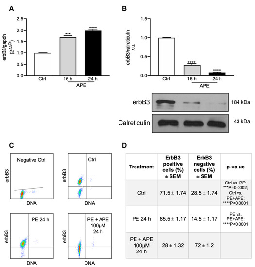 ErbB3 receptor expression in SCs. (A) qRT-PCR analysis shows that erbB3 receptor transcript levels are upregulated already after 16 h and 24 h of APE treatment (*** p < 0.001; **** p < 0.0001; n = 3); (B) Representative Western blot analysis for erbB3 receptor. The expression of the receptor is significantly downregulated after 16 and 24 h of 100 µM APE treatment. The graph shows the average ± SEM of the OD of the bands normalized against the OD of the calreticulin, used as reference protein (Figure 3B; **** p < 0.0001; n = 3). (C,D) FACS analysis for erbB3 receptor shows a significant increase in the percentage of erbB3 positive cells after PE treatment (85.5 ± 1.17; Ctrl vs. PE *** p = 0.0002; n = 3) and a decrease in erbB3 positive cells after APE treatment (28 ± 1.32; PE vs. PE + APE, **** p < 0.0001; n = 3).