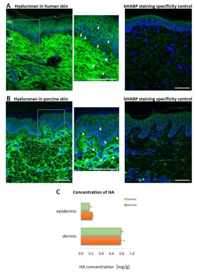 Its lack of immunogenicity comprises one of the most significant assets of HA; it acts to prevent the production of specific antibodies against HA [34,39]. Therefore, immunohistochemical methods are of no use in the detection of HA. We studied the distribution of HA in healthy human and porcine skin in the form of histological tissue sections using HA-specific binding peptide (bHABP) derived from bovine nasal cartilage [40]. bHABP has previously been used to identify HA in skin tissue sections [41]; however, in this case, the HA was observed using a light microscope, which resulted in insufficient appreciation of the structure of HA network. Therefore, we used a confocal microscope, which allowed for the three-dimensional reconstruction of the spatial distribution of the HA in the skin tissues.