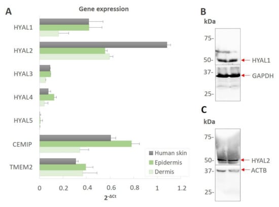 The total RNA from the human full-profile skin, dermis and epidermis (the dermis and epidermis were prepared as described in the preparation of the lysate from human skin) was isolated using the RNeasy kit (Qiagen), and the cDNA synthesis was performed using the SuperScript III First Strand Synthesis System (Thermo Fisher Scientific). cDNA was used as a template in TaqMan real-time PCR assays (StepOne™ Real-Time PCR System; ThermoFisher Scientific) according to the manufacturer’s instructions. The TaqMan assays used for the RT-qPCR comprised: ACTB Hs01060665_g1, HYAL1 Hs00201046_m1, HYAL2 Hs00186841_m1, HYAL3 Hs00185910_m1, HYAL4 Hs00202177_m1, HYAL5 Hs00162139_m1, CEMIP Hs01552114_m1 and TMEM2 Hs00910521_m1 (Thermo Fisher Scientific). The relative quantification threshold values (Ct) of the HYALs, TMEM2 and CEMIP were normalized by subtracting the Ct of the housekeeping gene β-actin (ACTB) so as to obtain ΔCt. The relative expression was then expressed as 2-ΔCt. This transformation allowed for the comparison of the relative gene expression levels for the respective gene and reflected the “signal strength” of the respective assays.