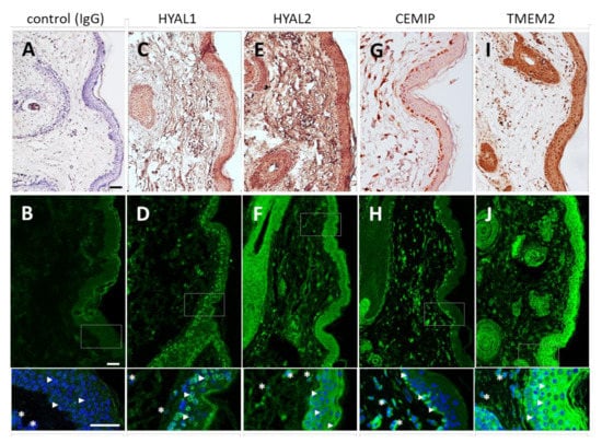 Localization of HYAL1, HYAL2, CEMIP and TMEM2 in the human skin. (A,B) Immunohistochemical and immunohistofluorescent analysis of IgG, (C,D) HYAL1, (E,F) HYAL2, (G,H) CEMIP and (I,J) TMEM2. The insets provide enlarged views of the regions in the gray boxes. The nuclei were stained with Höechst (blue). The asterisks indicate the fibroblasts, and the arrows indicate the keratinocytes. The scale bars at the bottom of the figures represent 50 μm. Abbreviations: hyaluronidase (HYAL), Transmembrane Protein type II (TMEM2), Cell Migration Inducing Hyaluronan Binding Protein (CEMIP).