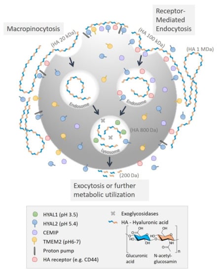 In addition to HYALs, cell surface hyaluronidase transmembrane protein II (TMEM2, also known as CEMIP2) has recently been identified [21]. TMEM2 provides for the degradation of extracellular HMW HA into approximately 5 kDa fragments in a Ca2+-dependent manner at a pH optimum of between pH 6 and 7 [21]. TMEM2 comprises the predominant mediator of HA degradation and integrin-mediated cell substrate adhesions in cancer cells [22].