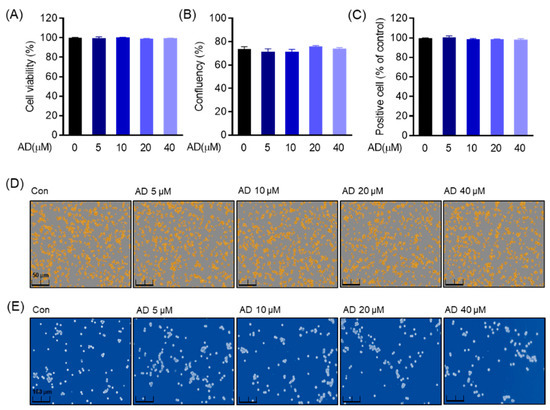 The cytotoxic effect of AD on RAW 264.7 cells was detected by an MTT assay according to the following procedure. RAW 264.7 (5 × 103 cells/well) cells were seeded in 96-well plates and maintained at 37 °C in a humidified 5% CO2 incubator for 24 h. Cells were treated in the presence or absence of different concentrations of AD for 5 days. Then, 4,5-dimethylthiazol-2-thiazolyl)-5-diphenyltetrazolium bromide (MTT) (5 mg/mL) was added to each well. Next, cells were incubated for 4 h before the supernatant was replaced with dimethyl sulfoxide (DMSO) to dissolve formazan crystals. Cell viability was exhibited at the 540 nm absorbance in a microplate reader (TECAN infinity pro 2000, Männedorf, Switzerland). The results shown are representative of three independent experiments. After trypan blue staining was also treated in the presence or absence of different concentrations of AD for 5 days, RAW 264.7 cells were stained with 0.4% trypan blue and photographed under an optical microscope (CKX53, Olympus, Tokyo, Japan). The amount of positive cells was estimated by counting stained and unstained cells.
