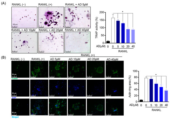 RAW 264.7 cells (1 × 103 cells/well) were cultured in 24-well culture plates in DMEM containing 10% FBS, 100 U/mL of penicillin, and streptomycin. After being incubated for 24 h, the medium was changed to α-MEM containing RANKL (50 ng/mL), and cells were treated with AD at different concentrations. The medium was refreshed every day. After 5 days of incubation, the medium was removed and washed twice with phosphate-buffered saline (PBS). Then, cells were fixed with 4% formaldehyde for 15 min and washed with PBS. Osteoclast differentiation was measured by the Acid Phosphatase Assay Lit (Cat. No. CS 0740) and acid phosphatase leukocyte (Cat. No. 387A-1KT) from Sigma-Aldrich Fine Chemicals (Saint Louis, MO, USA) according to the instruction of the manufacturer. Briefly, fixed cells were reacted with a leukocyte acid phosphatase kit at 37 °C, 5% CO2 for 1 h, and then the reaction was conducted in a shaded state. Next, cells were washed three times with PBS and TRAP-positive multinuclear cells, which have three or more nuclei, according to optical microscopic observations.