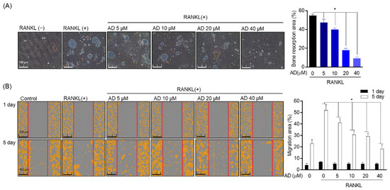 RAW 264.7 cells were seeded at the density of 1 × 103 cells/well in 6-well plates. Then, cells were incubated for 24 h followed by a constant scratching before being treated or untreated with RANKL (50 ng/mL) and the indicated AD concentration. The amount of migration of yellow marked cells in the indicated red line was measured on the first day and fifth day after treatment using Incucyte® Live Cell analysis systems. The only RANKL-treated group was used as a normalized percentage.