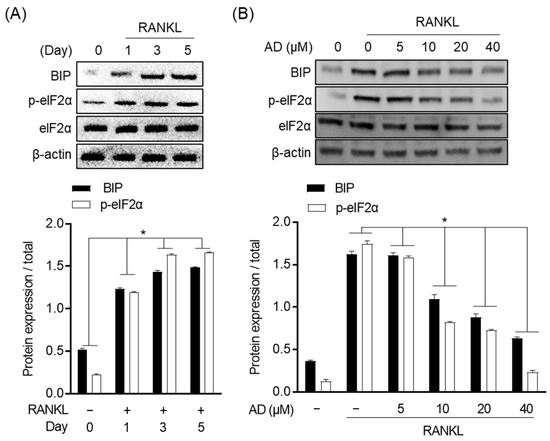 RAW 264.7 cells were pretreated with or without AD (5–40 µM) and stimulated with RANKL (50 ng/mL) to detect the activation of MAPK. The total lysate was prepared using RIPA buffer containing protease inhibitors for 30 min on ice followed by centrifugation at 14,000 rpm for 20 min at 4 °C. Then, the Bradford assay was used to measure the protein concentration according to the instruction of the manufacturer. An equal amount of protein for each sample was separated in 12% SDS-PAGE gel. After electrophoresis, separated proteins were transferred onto the PVDF membrane (Bio-Rad, Hercules, CA, USA). The membrane was blocked in 5% skim milk for 1 h at room temperature. The membranes were incubated with anti-BIP, anti-phospho-eIF2α, and anti-eIF2α to detect the expression of ER stress; anti-NFATc1 and anti-c-fos to detect osteoclast transcription factors; and anti-phospho-ERK, anti-ERK, anti-phospho-JNK, JNK, anti-phospho-p38, and anti-p38 to detect expression of MAPK. Furthermore, β-actin was used as the housekeeping gene. Then, the membranes were incubated overnight at 4oC before being washed in TBS-T followed by the incubation with secondary antibodies. The antibody-bounded proteins were visualized with ECL Western blotting detection reagents (Thermo Fisher Scientific, Waltham, MA, USA) using ImageQuant LAS 4000 (GE Healthcare, Chicago, IL, USA). ImageJ software was employed to quantify the observed band and normalized with control.