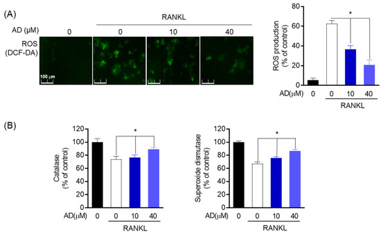 Antioxidant enzymes were measured using a Superoxide Dismutase Assay Kit (Cayman chemical, Ann arbor, MI, USA) and a Catalase Assay Kit (Cayman chemical, Ann arbor, MI, USA), respectively. RAW 264.7 cells treated with AD and RANKL were recovered using extraction buffer (20 mM HEPES buffer, pH 7.2, 1 mM EGTA, 210 mM mannitol, 70 mM sucrose) and centrifuged, while SOD was measured in a 450 nm ELISA plate reader from the recovered supernatant. Then, CAT was measured at 540 nm with an ELISA plate reader from the supernatant recovered using the extraction buffer (50 mM potassium phosphate, pH 7.0, 1 mM EDTA) according to the manufacturer’s instructions.