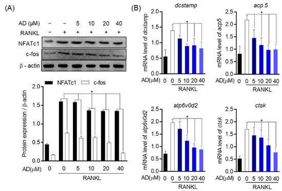 36]. In this study, AD suppresses the phosphorylation of MAPK activation and osteoclast differentiate downstream signal, including c-Fos and NFATc1. RANKL-induced osteoclast differentiation through oxidative stress and ER stress in the regulation of osteoclast differentiation is reported, relating to the inflammatory process [