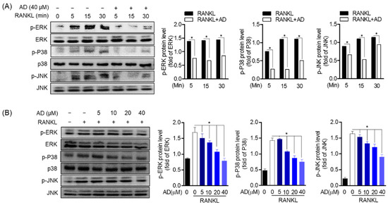 30]. The data revealed that RANKL-induced cells were able to form TRAP-positive osteoclast and that this process was inhibited by AD at this indicated experimental concentration. Osteoclast differentiation is regulated by various upstream signaling of MAPK, including JNK, ERK, and p38 [