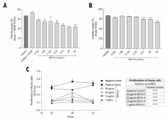 HUVEC (2 × 104 cells/per well) were seeded in a 24-well plate for four days at 37 °C in 5% CO2. Cell populations were normalized in serum-free medium for 24 h, after this step, the medium was aspirated and replaced by a medium containing BthTx-II (1, 10, 25 and 50 μg/mL). For positive control cells, RPMI medium with 10% FBS was used, while for negative control cells, IMDM medium was without FBS supplementation. All medium and treatment conditions were replaced every 24 h. After 72 h, 30 μL of MTT (5 mg/mL) (Sigma-Aldrich M2128, St. Louis, MO, USA) was added to each well and the plates were incubated for 3 h at 37 °C in 5% CO2. Formazan crystals were dissolved in 150 µL of DMSO for 15 min under gentle agitation. Absorbance was read at 570 nm using a microplate reader (Molecular Devices, Menlo Park, CA, USA). Blank spaces must produce values of 0 ± 0.1 O.D. units. The mean values of the triplicate readings were determined, and the mean blank value was subtracted. The data were expressed as O.D. values.
