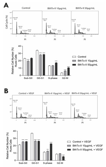 BthTx-II differently modulates cell cycle phases of HUVEC in the presence or absence of VEGF. Cell cycle histogram profile of HUVEC, and representative graph after treatment with different concentrations of BthTx-II (10 and 50 μg/mL) in the (A) absence or (B) presence of VEGF for 24 h. *** p < 0.001, and **** p < 0.0001 when compared to the respective control group. Data are expressed as mean ± standard error of experiments performed at least three times independently in triplicates.