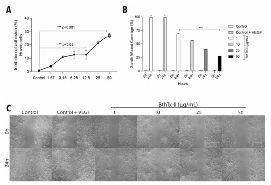Different BthTx-II concentrations (1.57 to 50 μg/mL) inhibited HUVEC adhesion, with the highest concentration (50 µg/mL) inhibiting adhesion by approximately 28% with respect to the control (Figure 3A). The wound-healing assay demonstrated that BthTx-II (1, 10, 25 and 50 μg/mL) was able to significantly reduce HUVEC migration after 24 h of treatment when compared to the control groups (Figure 3B,C).