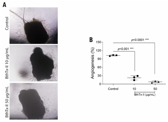 Thus, in the present study, we assessed, for the first time, the antiangiogenic effect of Asp-49 PLA2 BthTx-II on the invasion, migration, and proliferation of HUVEC, as well as its capacity to inhibit the sprouting angiogenic process through an ex vivo aortic ring assay. Furthermore, in vivo tumor suppression and antiangiogenic activities were analyzed using MDA-MB-231 cells with Matrigel injected into the chorioallantoic membrane of chicken embryo (CAM). Given our findings, we highlighted a new possible role for BthTx-II as a potential prototype for the development of new tools and antiangiogenic drugs in cancer therapy.