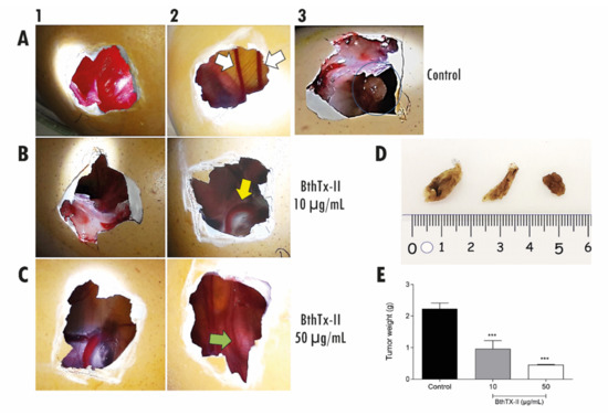 In vivo tumor angiogenesis by CAM assay. (A1) Control and tumor growth. (A2) Formation of new vessels. (A3) Tumor developed. (B1) Start of treatment with BthTX-II (10 µg/mL). (B2) After 4 days of treatment with BthTX-II (10 µg/mL). (C1) Start of treatment with BthTX-II (50 µg/mL). (C2) After 4 days treatment with BthTX-II 50µg/mL. (D) Tumor reduction photo after treatment with BthTx-II represented and ordering by control, 10 and 50 µg/mL. (E) Weight of tumors (g). Statistically significant values were represented by *** p < 0.0001.
