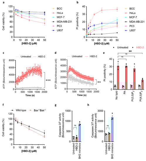 HBD-2 induces tumour cell death in a non-apoptotic manner. (a) Dose-dependent reduction in cell viability of different tumour cell lines (BCC, HeLa, MCF-7, MDA-MB-231, PC3 and U937) determined by tetrazolium-based assay. Data normalised against untreated control, which was arbitrarily assigned 100% viability. (b) Flow cytometry-based PI uptake assay on tumourigenic BCC, HeLa, MCF-7, MDA-MB-231, PC3 and U937 cells. The level of permeabilisation was expressed as PI positivity. ATP bioluminescence assay of HeLa (c) and U937 (d) cells treated with HBD-2 (50 µM) titrations. The level of ATP released was detected as bioluminescence emission signal intensity. Data represent mean ± SEM of three independent experiments. ** p < 0.01, *** p < 0.001; Two-way ANOVA. (e) Flow cytometry-based PI uptake assay on HBD-2 or PBS pre-incubated with PA, PI(3,5)P2 or PI(4,5)P2 lipids on U937 cells. ** p < 0.01, ns: not significant; unpaired t-test. (f) Dose-dependent reduction in cell viability of MEF wild-type and MEF Bax/Bak double knockout cells. Caspase-Glo 3/7 activity assay on U937 (g) and HeLa (h) cells treated with HBD-2 or BH3 mimetics over 30 min. Data represent the mean ± SEM of three independent experiments. ns: not significant; unpaired t-test.