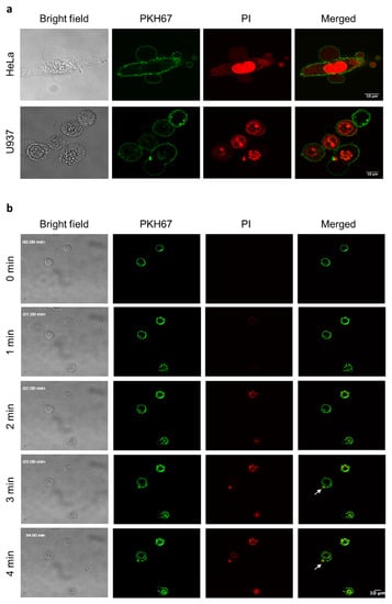 Live imaging was performed on a Zeiss LSM-780 confocal microscope using a 63× oil immersion objective in a 37°C incubator with 5% CO2. Adherent HeLa cells were cultured overnight on coverslips while suspension U937 cells were immobilised onto 0.01% (w/v) poly-L-lysine-coated coverslips. Both cell types were prepared in serum-free RPMI 1640 medium containing 0.1% (w/v) BSA and 2 μg/mL PI. HBD-2 was added to directly to the imaging chamber to final concentration of 25 μM. Excitation and emission wavelengths were 488 nm and 514 nm (for green channel, PKH67), and 514 nm and 633 nm (for red channel, PI), respectively.