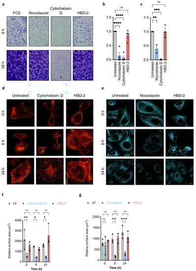 Many defensins, such as PvD1, HBD-1 and HBD-3 have been shown to perturb tumour cell migration, often via the disruption of cytoskeleton dynamics [13,14,17,30]. Since PI(4,5)P2 and other phosphoinositides are pivotal signalling messengers orchestrating the cell migration machinery, we, therefore, sought to determine whether the PI(4,5)P2-binding defensin HBD-2 could suppress tumour cell migration. To this end, a transwell migration assay was conducted on human metastatic breast cancer cells MDA-MB-231, with FBS as the migratory stimulus. Unlike cytochalasin D (actin polymerisation inhibitor) and nocodazole (tubulin inhibitor) treatments, which are known to block cell migration [31], HBD-2 did not affect FCS-induced MDA-MB-231 migration over 6 h or 24 h period (Figure 3a–c). Similar results were also observed for PC3 cells (Figure S1). Furthermore, whilst cytochalasin D and nocodazole caused drastic changes in actin network and microtubules, respectively, with a significant reduction in relative cell surface area post-treatment, HBD-2 had little effect on these cytoskeleton elements even after 24 h (Figure 3d–g).