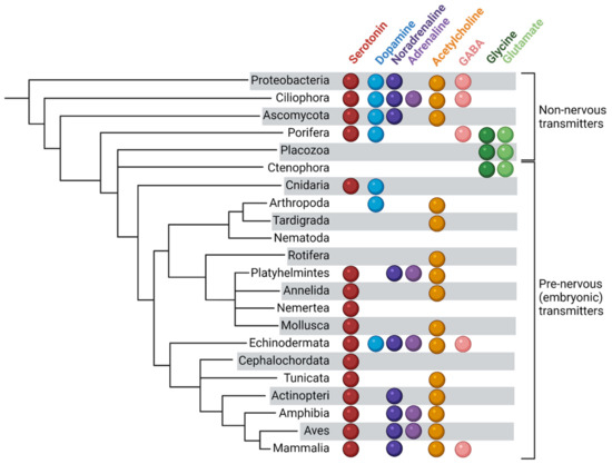 - Moroz, L.L.; Romanova, D.Y.; Kohn, A.B. Neural versus alternative integrative systems: Molecular insights into origins of neurotransmitters. Phil. Trans. R. Soc. B 2021, 376, 20190762. [Google Scholar] [CrossRef]