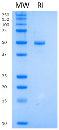 RI was originally purified from placenta [], while the first recombinant RI (porcine) in an active form was expressed in S. cerevisiae [], at a low yield (0.2 mg recombinant protein/g wet cells). The first successful attempt to express RI in E. coli yielded 0.25 mg RI/L culture in 1989 []. The solubility of RI is very low and its expression in E. coli often leads to inclusion bodies. Later modification of the expression procedure led to higher yields: 15 mg/L culture [] for porcine RI. Addition of the reducing agent dithiotreitol (DTT), low production temperature and co-expression of the chaperonin GroELS resulted in high level production using the conditions with the EnBase® technology [,]. Another promising attempt was to use N-terminal tags to increase the solubility of RI. Three protein tags: maltose binding protein (MBP), N-utilization substance A (NusA) and translation initiation factor 2 domain I (IF2) have improved the solubility of murine RI, enhancing the recombinant protein yield to 24–34 mg/L culture []. Expression of RI in insect cells was also accomplished in stably transfected D. melanogaster cells to yield 1.4 mg/L recombinant human RI []. Although several methods were published for the expression of RI, these processes require special conditions or a multi-step purification streamline with addition cleavage of tags, which make them hardly reproducible in common laboratories.