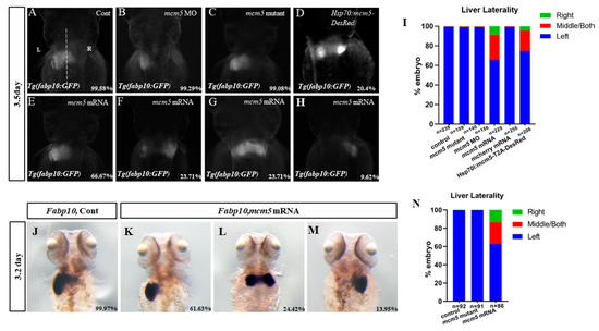 Figure 1. MCM5 overexpression, but not loss of function, leads to liver bifida. (AI) In our observations, 99.58% of the Tg(lfabp10:GFP) control embryos displayed a left-sided liver (A,I, n = 293). In the mcm5 morphants or mcm5 mutants, the liver became mildly smaller (B,C) than that in the control embryos; 99.29% of the mcm5 morphants (B,H, n = 140, p > 0.05) and 99.08% of the mcm5 mutants (C,I, n = 103, p > 0.05) displayed a left-sided liver. In embryos with a forced expression of mcm5, the proportions of embryos with a left-sided liver, liver bifida, and a right-sided liver were 66.67% (E,I, n = 156, p = 0.00025), 23.71% (F,G,I, n = 156, p = 0.0026), and 9.62% (H,I, n = 156, p = 0.0064), respectively. Similarly, in embryos with a forced expression of mcm5 by heat-shock at 40% epiboly, the proportion of embryos with liver bifida and a right-sided liver was increased when compared with the control embryos (D,I, n = 206, p = 0.0035). In total, 97.4% of the embryos injected with mCherry mRNA displayed a left-sided liver (I, n = 229, p = 0.35). (JN) In the wild-type embryos, the rate of left-sided expression of lfapb10 was 99.97% (J,N, n = 92), while 99.89% of the mcm5 mutants displayed left-sided expression of lfabp10 (J, n = 91, p = 0.93). In total, 61.63% (K,N, n = 86, p = 0009), 24.42% (L,N, n = 86, p = 0.0006), and 13.95% (M,N, n = 86, p = 0.0017) of embryos injected with mcm5 mRNA displayed a left-sided, both-sided, and right-sided expression of lfabp10, respectively.