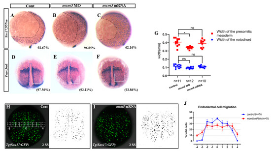 Figure 2. A forced expression of mcm5 depressed endodermal migration. (AC) Compared with that in the control (A, n = 109), the migration of endodermal cells in mcm5 morphants was normal (B, n = 127), but the endodermal migration in embryos injected with mcm5 mRNA was slowed down (C, n = 111, p = 0.0014). (DG). Papc staining showed no difference in the width of the notochord (blue frame shown) between the control (D, n = 41; G, n = 11) and embryos injected with mcm5 mRNA (E, n = 38; G, n = 10, p = 0.3), but the width of the notochord was mildly decreased in mcm5 morphants (E, n = 38; G, n = 12, p = 0.015). The width of the presomitic mesoderm (white frame shown) in mcm5 morphants was also mildly decreased (E, n = 38; G, n = 12, p = 0.12), but it was normal in embryos injected with mcm5 mRNA (F, n = 56; G, n = 10, p = 0.69). (HJ) In Tg(Sox17:GFP) embryos, quantitative analysis showed no GFP-labeled cells in the “−4” area or “4” area in control embryos (H,J, n = 5), while about 10 and 12 GFP-labeled cells were observed in the “−4” area (I,J, n = 5, p = 0.00001) and the “4” area (I,J, n = 5, p = 0.00007), respectively, in embryos injected with mcm5 mRNA.