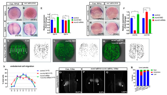 Figure 4. The downregulation of the Cxcr4a-itgb1b cascade slowed down endodermal migration in embryos injected with mcm5 mRNA. (AE) Compared with that in control embryos (A,C), the expression of itgb1a and itgb1b was decreased in embryos injected with mcm5 mRNA (B,D). Quantitative PCR results showed that the expression level of itgb1a mRNA in embryos injected with mcm5 mRNA was 0.9-fold to that in the control (E, p = 0.001), but it was no different in the mcm5 morphants or in the control (E, 0.95-fold, p = 0.67). The itgb1b level in embryos injected with mcm5 mRNA was 0.38-fold to that in the control (E, p = 0.001), while the level in mcm5 morphants was 1.20-fold to that in the control (E, p = 0.03). (FJ) In embryos injected with mcm5 mRNA, the expression levels of cxcr4a and cxcl12b were decreased (F,G) and increased (H,I), respectively. Quantitative PCR indicated that the expression levels of cxcr4a and cxcl12b in embryos injected with mcm5 mRNA were also downregulated (J, 0.19-fold relative to the control, p = 0.0009) and upregulated (J, 1.35-fold relative to the control, p = 0.0002), respectively. In mcm5 morphants, the expression levels of cxcr4a and cxcl12b were upregulated (J, 1.24-fold relative to the control, p = 0.0003) and downregulated (J, 0.9-fold relative to the control, p = 0.02), respectively. (KM) Compared with that in the control (K, n = 25, 92%), GFP-labeled endodermal migration in cxcr4a morphants was slowed down (L, n = 122, 88.5%, p < 0.01), but mcm5 mRNA and cxcr4a mRNA co-injection restored endodermal migration (M, n = 98, 73.5%, p < 0.05). Quantitative analysis for the selected area (shown in K) showed that migration of the delayed endodermal cells in the “−4” area and the “4” area in embryos injected with mcm5 mRNA was restored by co-injection with cxcr4a mRNA (N, n = 5). (OR) An injection of cxcr4a mRNA restored the liver location in embryos injected with mcm5 mRNA. An injection of cxcr4a mRNA (30 ng/µL or more) resulted in a small proportion of the embryos displaying liver bifida (R, last column shown, n = 181, p < 0.05). Co-injection with a low dose of cxcr4a mRNA (15 ng/µL) and mcm5 mRNA resulted in 10.1% and 4.7% of embryos displaying liver bifida and a right-sided liver, respectively (P,Q). Co-injection with cxcr4a mRNA and mcm5 mRNA restored the liver location phenotype in embryos injected with mcm5 mRNA (R, columns 2 and 3, n = 267, p < 0.05).