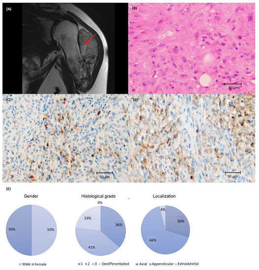- Kostine, M.; Cleven, A.H.; de Miranda, N.; Italiano, A.; Cleton-Jansen, A.-M.; Bovee, J. Analysis of PD-L1, T-cell infiltrate and HLA expression in chondrosarcoma indicates potential for response to immunotherapy specifically in the dedifferentiated subtype. Mod. Pathol. 2016, 29, 1028–1037. [Google Scholar] [CrossRef] [Green Version]