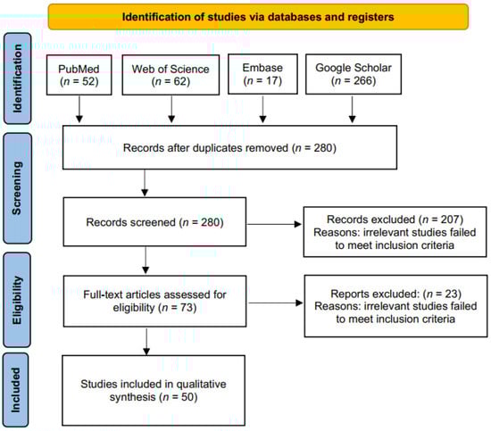 Flow diagram of the process of study selection. Two hundred and eighty studies were retrieved based on the search strategy described in the methodology. After reviewing the titles and abstracts of these studies, 73 studies were obtained. After reviewing the full text of these studies, 50 studies met the criteria for inclusion in this systematic review.